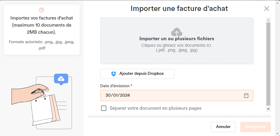 Depuis l’onglet “Achats”, il faut cliquer sur le bouton "Importer une facture". Une fenêtre s'ouvre dans laquelle vous pouvez intégrer un ou plusieurs documents provenant de votre ordinateur. Précisez la date d’émission, et vous pouvez “Séparer votre document en plusieurs pages” si elle provient de plusieurs fournisseurs. Il faudra ensuite relier la facture à une transaction dans l’onglet “Banques” en cliquant sur “Ajouter un justificatif”. Recherchez la facture concernée, sélectionnez-la puis “Valider”.