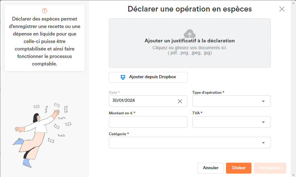 Il faut ensuite cliquer sur le bouton "Déclarer une opération en espèces". Vous pouvez alors ajouter une opération en espèces en renseignant la date, le type d'opération, le montant, le taux de TVA et la catégorie (comptabilité de trésorerie) ou un tiers (comptabilité d'engagement). Il est possible de diviser l'opération si celle-ci a plusieurs catégories ou plusieurs tiers.