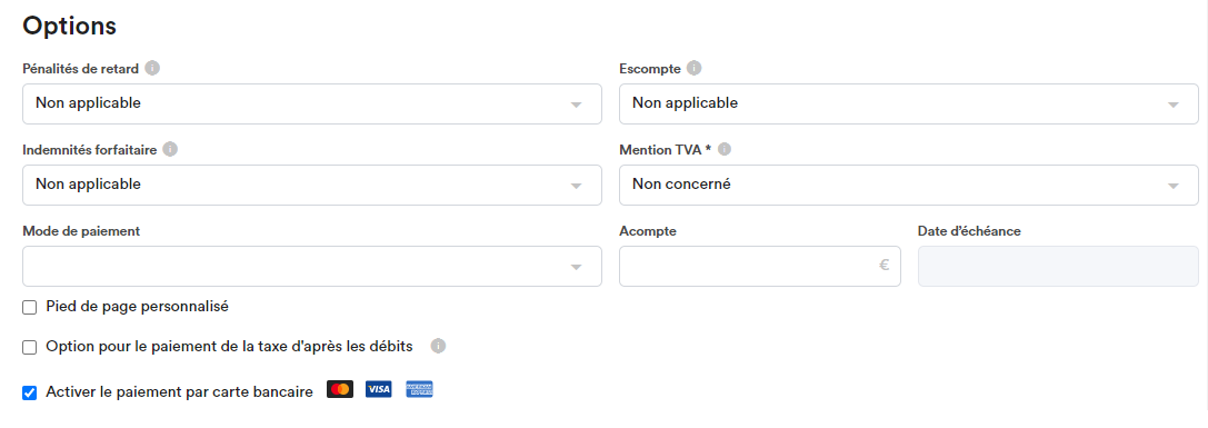 Dans le bloc “Options”, ajoutez un acompte - modifiez vos mentions légales. Vous pouvez également encaisser vos clients par carte bancaire en leur envoyant un lien de paiement sur vos factures de ventes. Pour cela il faut cocher "afficher un lien de paiement par carte bancaire sur la facture" et auparavant, configurer son compte dans "Paramètres/ventes".