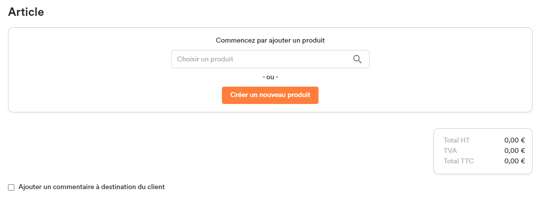 Dans le bloc “Article”, ajoutez un article à votre facture. Si vous n'avez pas encore d'articles enregistrés dans Clementine, cliquez sur "Créer un nouveau produit". Choisissez ensuite la quantité, le type, l'unité, le prix unitaire HT et ajoutez une remise si nécessaire.