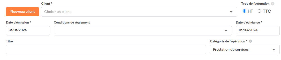Dans le bloc “Client”, ajoutez un client à votre facture. Si vous n'avez pas encore de clients enregistrés dans Clementine, cliquez sur "Nouveau client". Ensuite choisissez une date d'émission - des conditions de règlement - une date d'échéance - un titre et la catégorie de l'opération.