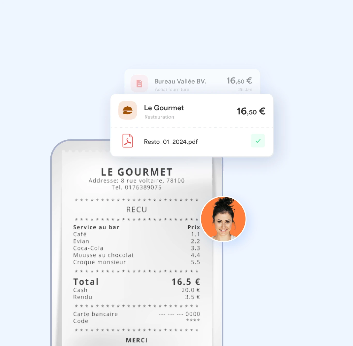 Notre application mobile est équipée d’un système d’intelligence artificielle et de reconnaissance visuelle qui lit les informations d’une photographie pour en extraire les éléments essentiels. Photographiez vos reçus, l’application génère automatiquement les notes de frais correspondantes.