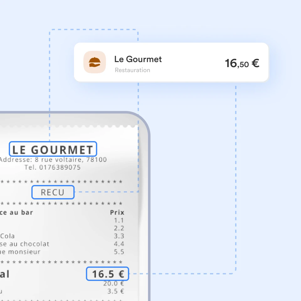 Notre application mobile est équipée d’un système d’intelligence artificielle et de reconnaissance visuelle qui lit les informations d’une photographie pour en extraire les éléments essentiels. Photographiez vos reçus, l’application génère automatiquement les notes de frais correspondantes.