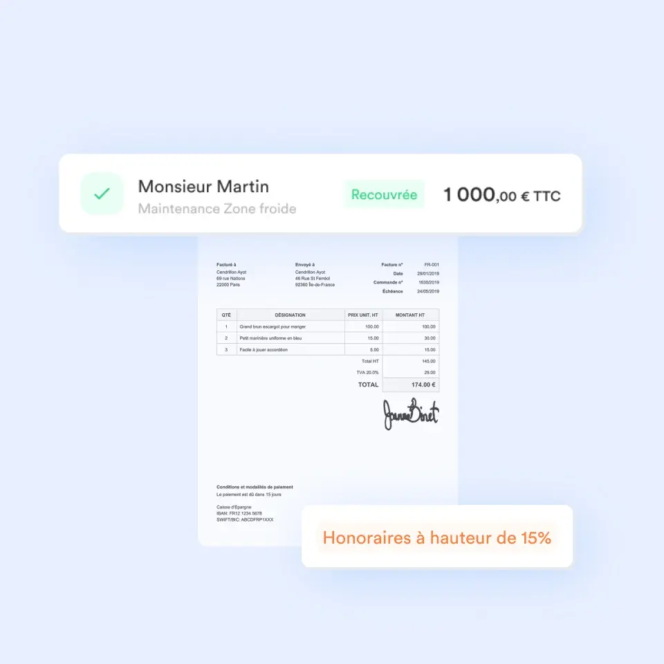 Pas de surprises : avec Clementine.fr, aucuns frais ne vous seront facturés tant que la créance n’est pas recouvrée. En cas de succès, des honoraires à hauteur de 15% seront appliqués.