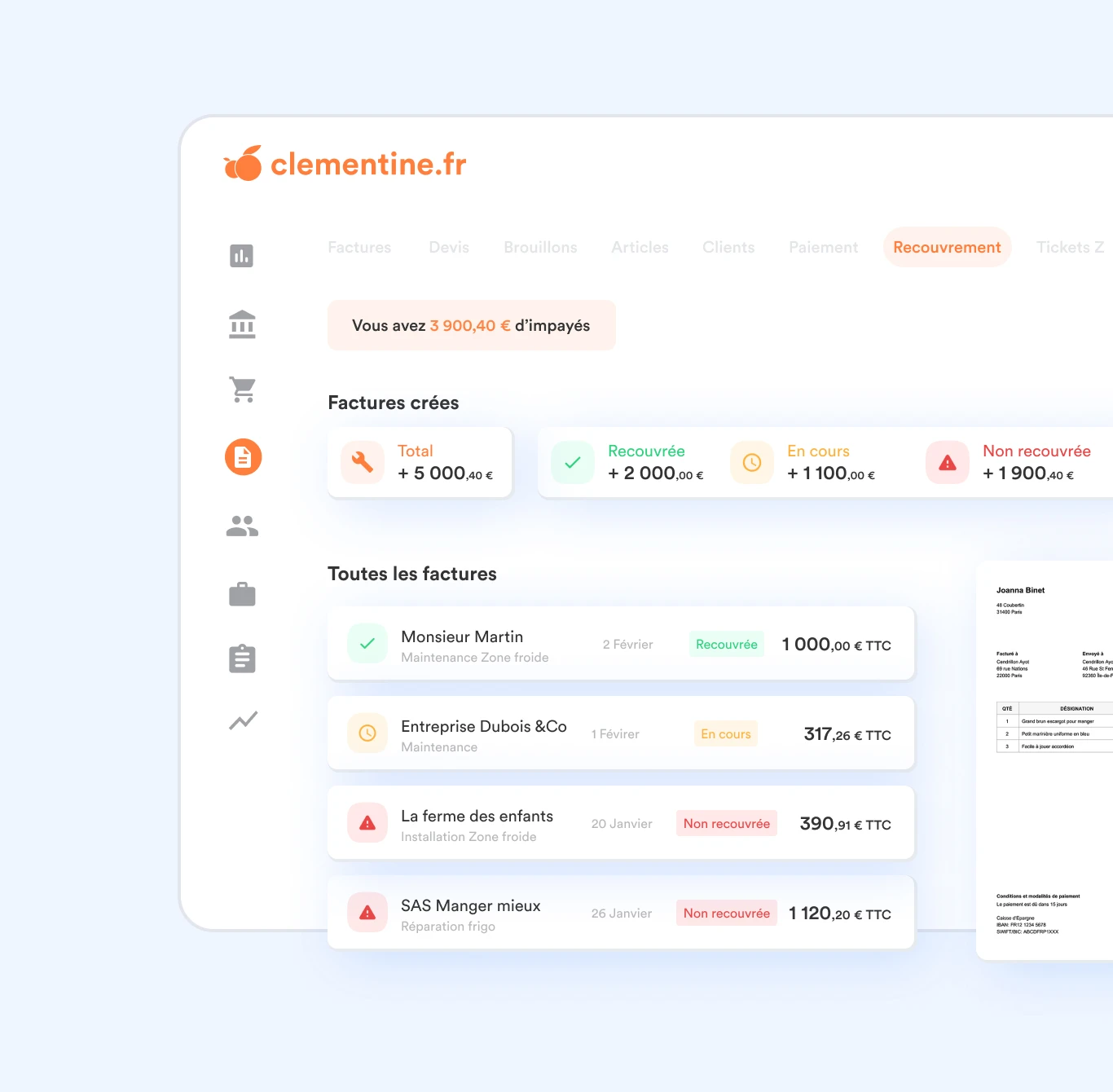 Vous avez une facture impayée ? Vous pouvez la déposer directement depuis votre interface Clementine, votre facture sera envoyée à une étude de recouvrement.