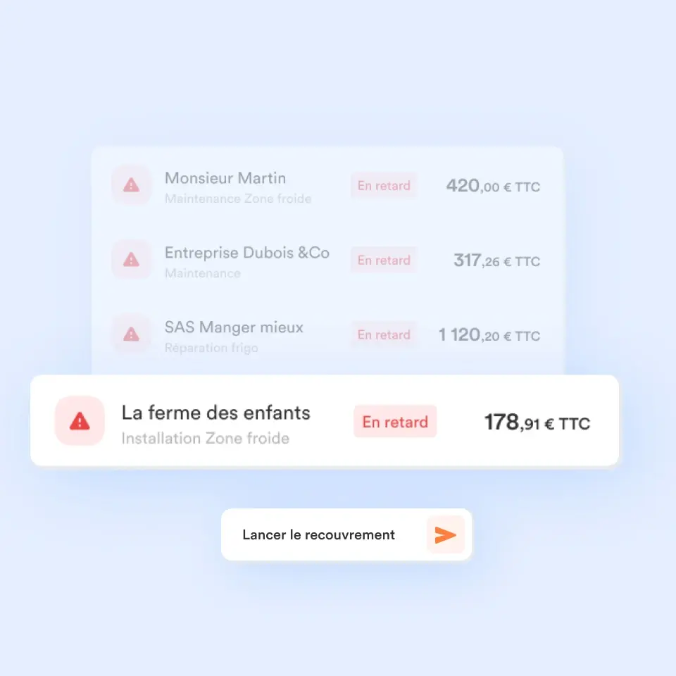 En quelques clics, identifiez vos factures impayées et lancez le recouvrement. Simplifiez vos démarches pour récupérer vos créances.