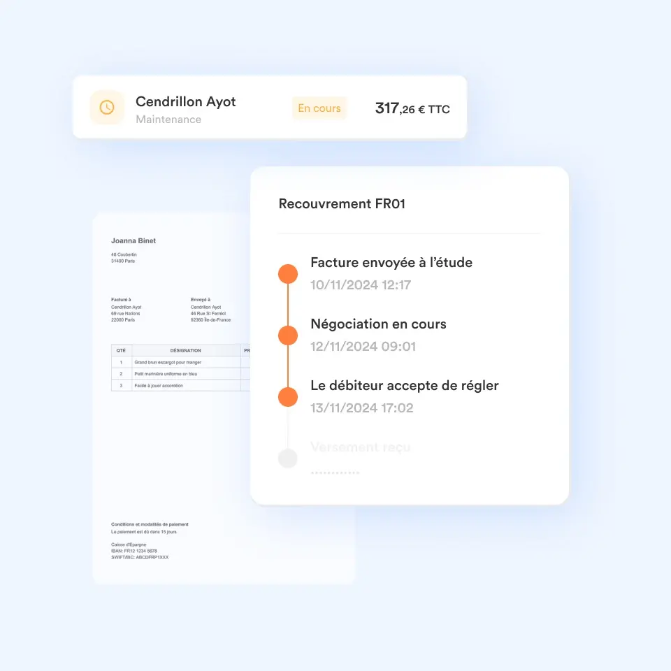 Accédez en temps réel aux statuts de vos recouvrements et gardez un œil sur l’évolution de vos créances. Un tableau de bord clair et intuitif pour gérer facilement vos finances.